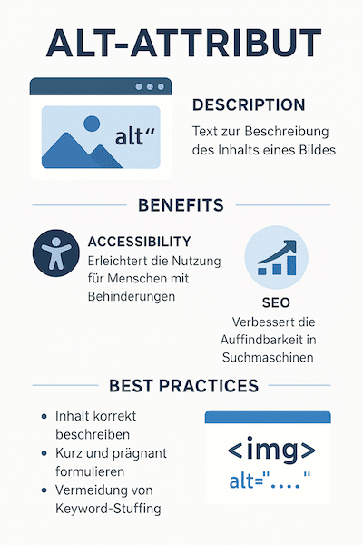 Das Alt-Attribut (kurz für „Alternative Text“) ist ein Bestandteil des HTML-Bildtags <img> und dient dazu, den Inhalt oder die Funktion eines Bildes textlich zu beschreiben. Es handelt sich dabei um eine unsichtbare Bildbeschreibung, die im HTML-Quellcode steht und nur angezeigt oder vorgelesen wird, wenn das Bild nicht geladen werden kann oder von Screenreadern interpretiert wird.